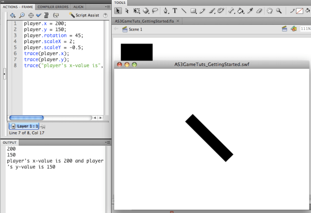 trace("player’s x-value is", player.x, "and player’s y-value is", player.y); //output the x and y values so we can see them and make sure everything is working fine