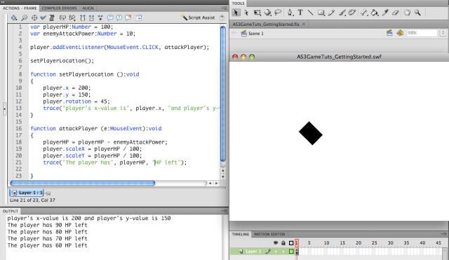 trace(“The player has”, playerHP, “HP left”); //Output how much HP the player has left, just to check
