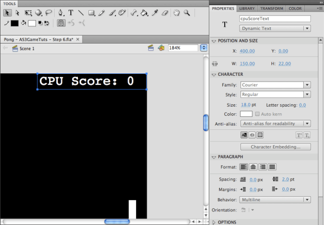 Basically just repeat what we did for the playerScoreText: Create a text field, type in: CPU Score: 0, set it to Dynamic Text, give it the instance name cpuScoreText, and format it like you did the last one. I positioned my cpuScoreText at (400,0) and gave it a width of 150.