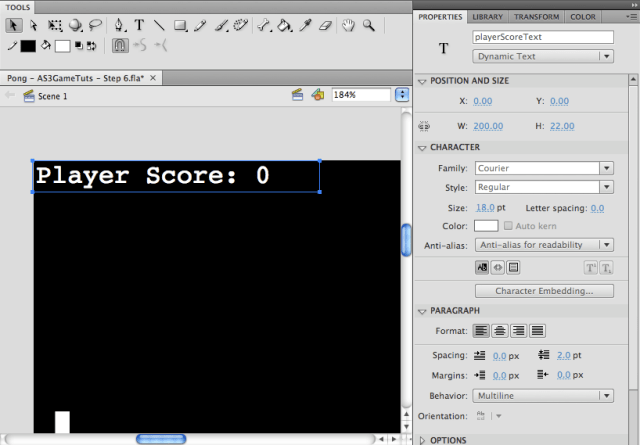 The rest of the formatting doesn’t really matter, except to make it look differently. Feel free to either use the formatting shown in the image above, or to format the text field on your own. Personally I set the color to white, used a size 18 Courier font, set the position to (0,0) and set the width to 200 so that the text field has extra space in case the score takes up multiple digits.