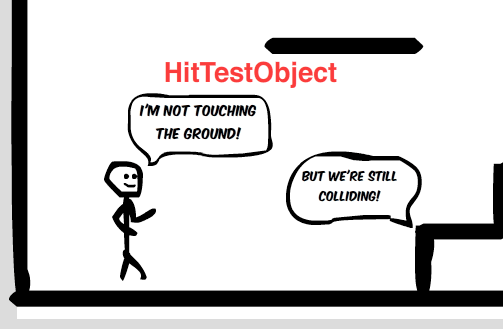Sounds good, right? Wrong. The problem with hitTestObject is that is checks for a collision between the bounding boxes of each object, not each object itself. This means that if either of the objects is within a rectangular area that bounds the other object, the hit test will return true, even if there is nothing drawn at that specific point. In our game, even if the player isn’t touching any platforms, as long as he is within the overall perimeter of the background object, the game will think they are colliding.