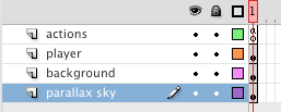 Create a new layer on the main timeline, which I named “parallax sky”, and drag it beneath the background’s layer. (In fact, I created a couple more layers as well, to stay organized… one for the player, which goes on top of the background, and an additional one on the very top which only holds code — no objects on the stage.)