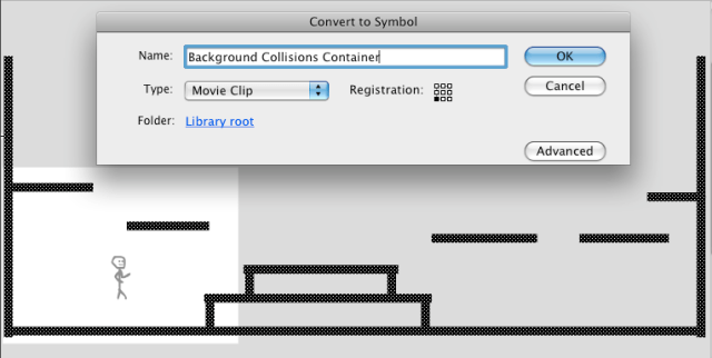 Select everything inside the background object. Hit Modify –> Convert to Symbol… (Hotkey F8) to turn the current outline of the background into a Movie Clip. I named mine the Background Collisions Container, and I set the Registration to the bottom-left corner.